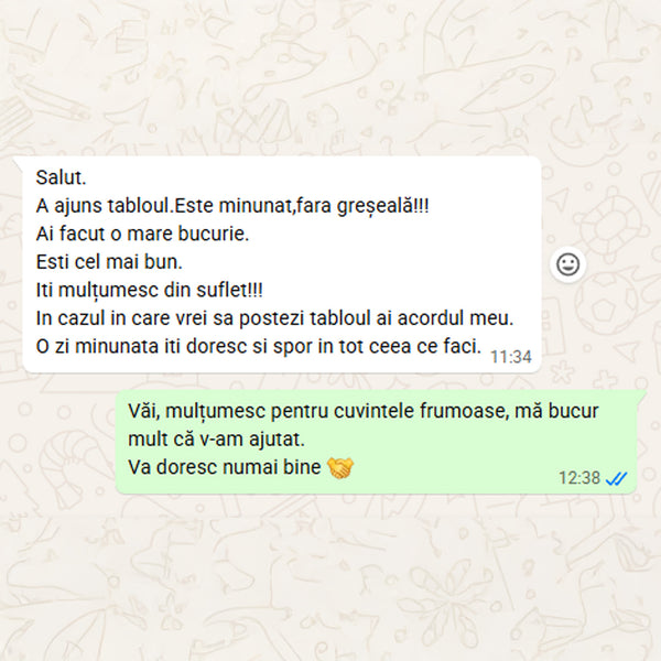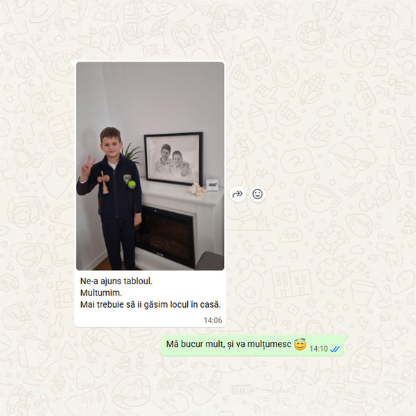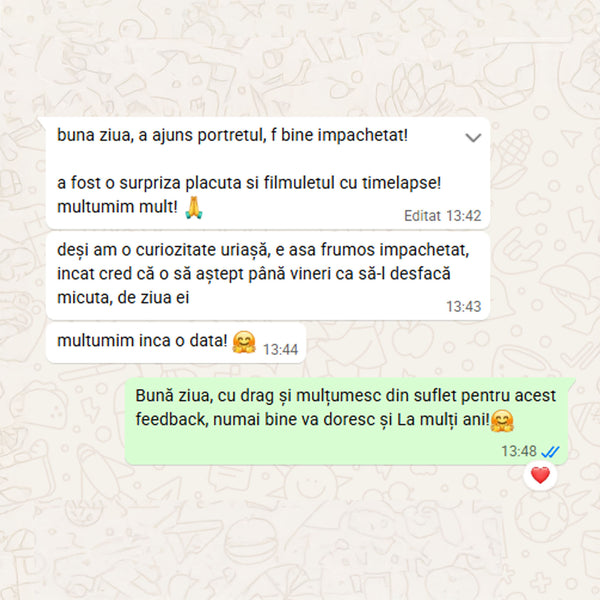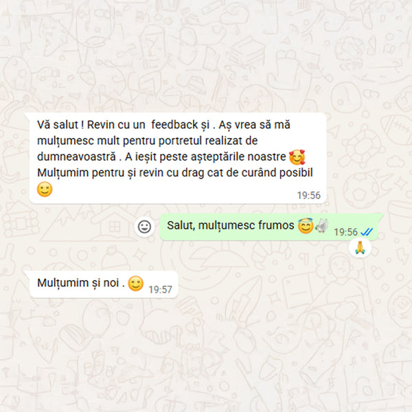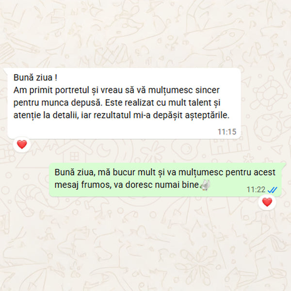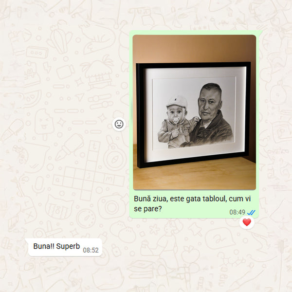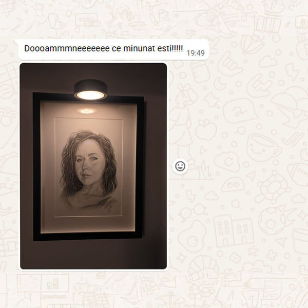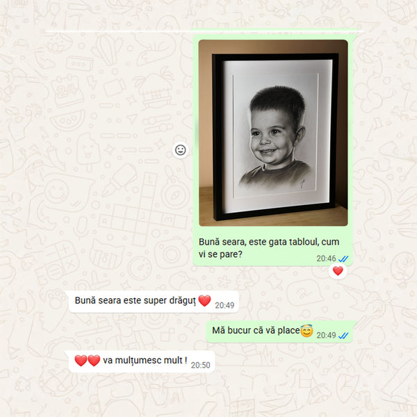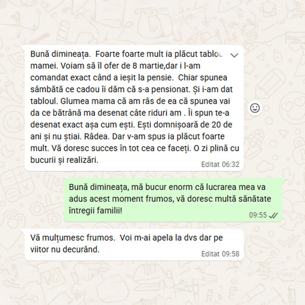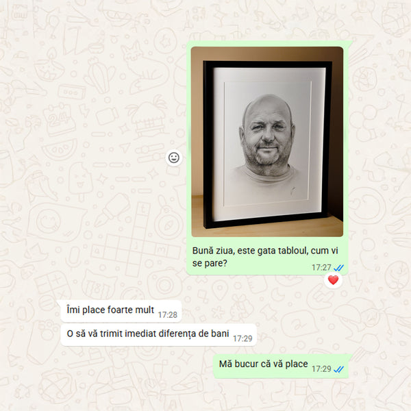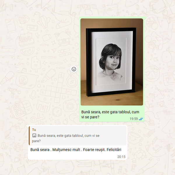 Când tabloul este gata, îți voi trimite o fotografie digitală pentru aprobare. După confirmarea finală și plata restului de sumă (dacă e cazul), portretul va fi expediat în 1-2 zile lucrătoare (în România) sau 5-12 zile lucrătoare (în Europa)
