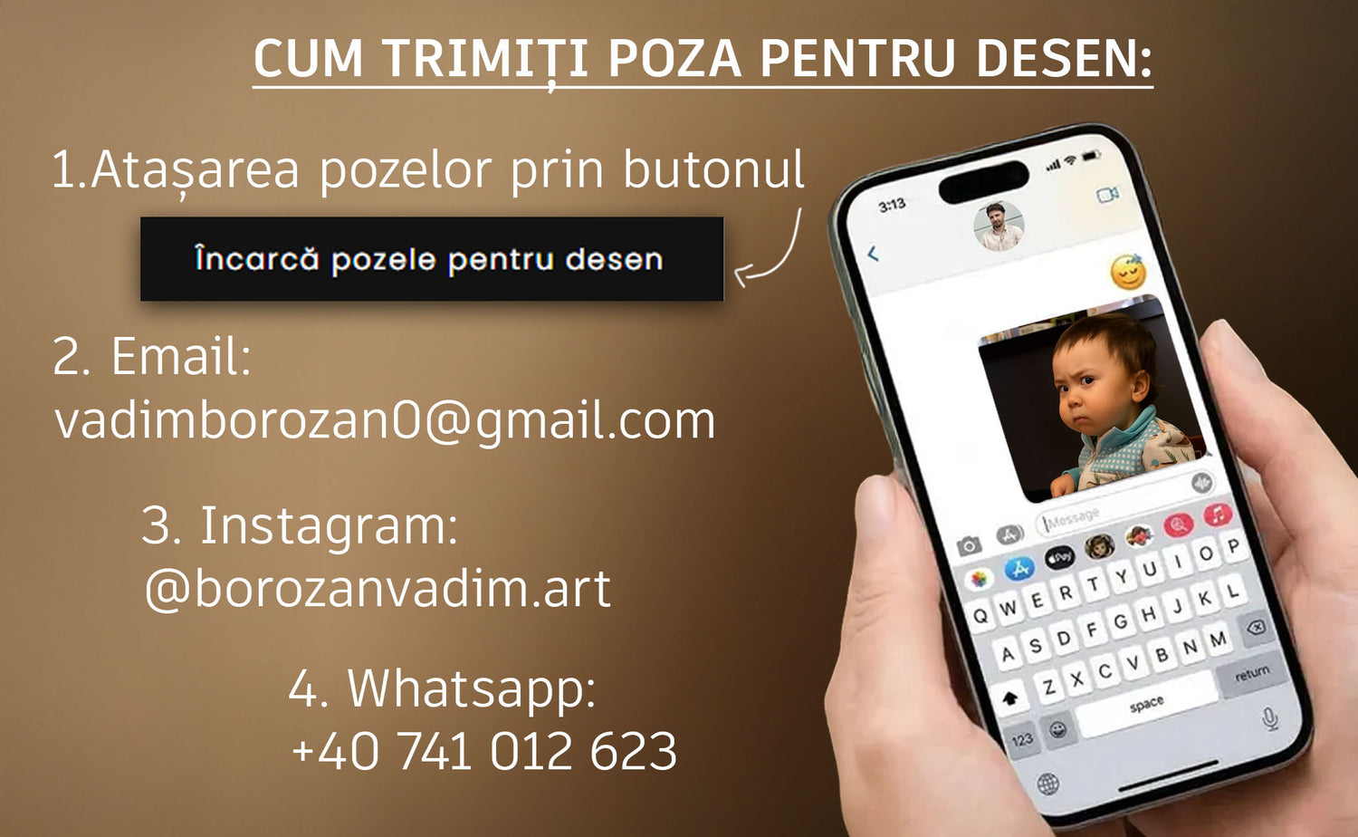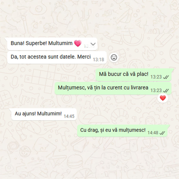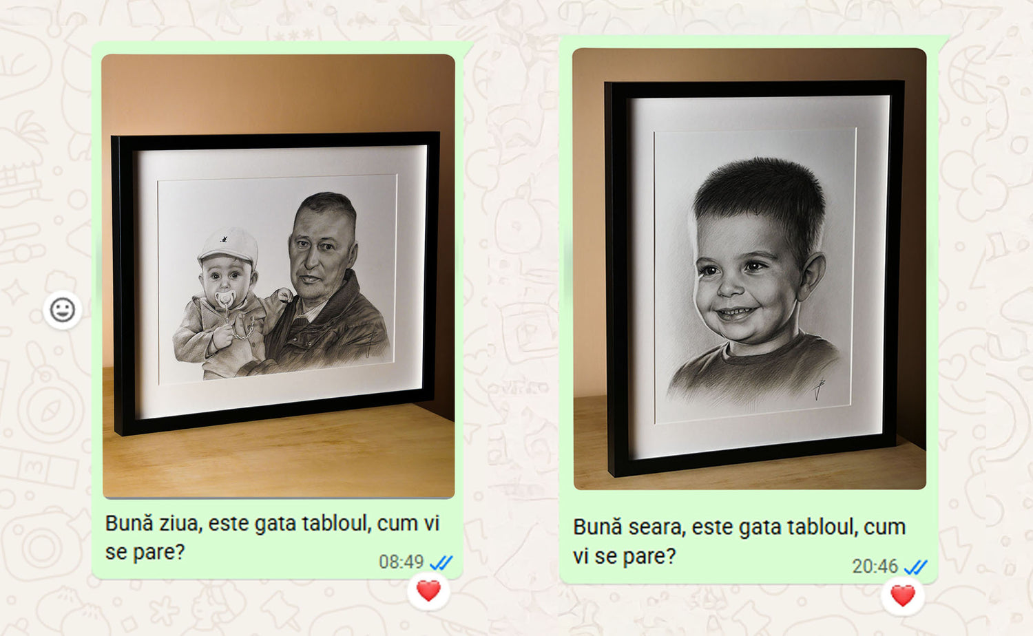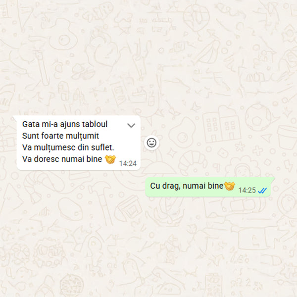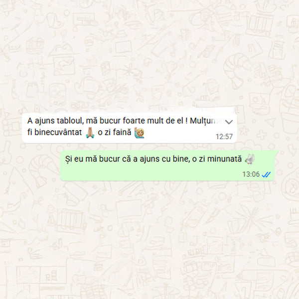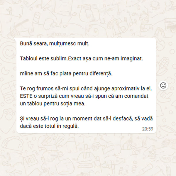 Când tabloul este gata, îți voi trimite o fotografie digitală pentru aprobare. După confirmarea finală și plata restului de sumă (dacă e cazul), portretul va fi expediat în 1-2 zile lucrătoare (în România) sau 5-12 zile lucrătoare (în Europa)